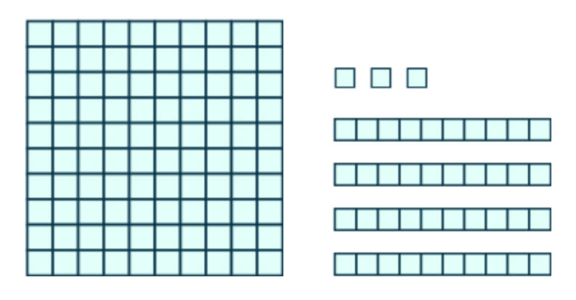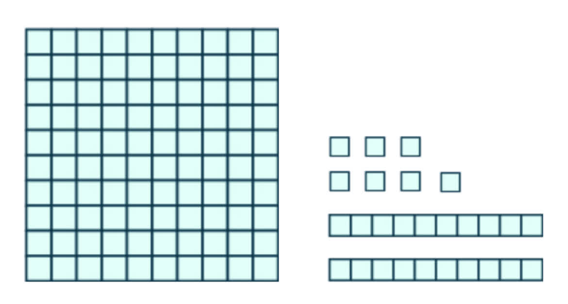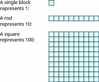 There are many ways to represent whole numbers visually, and one way we can do so is with blocks. We can use base-10 blocks to represent ones, tens, and hundreds as shown in the following figure: